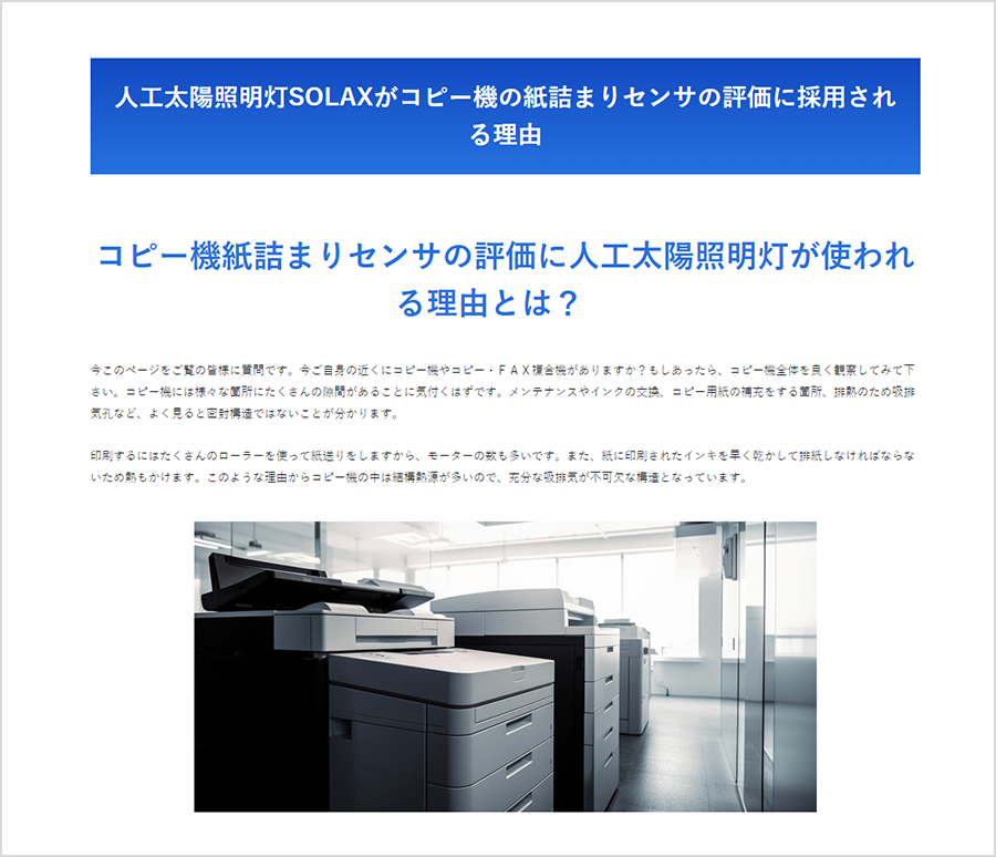 ・用途別採用実績「コピー機の紙詰まりセンサの評価」ページはこちらから人工太陽照明灯SOLAXがコピー機の紙詰まりセンサの評価に採用される理由