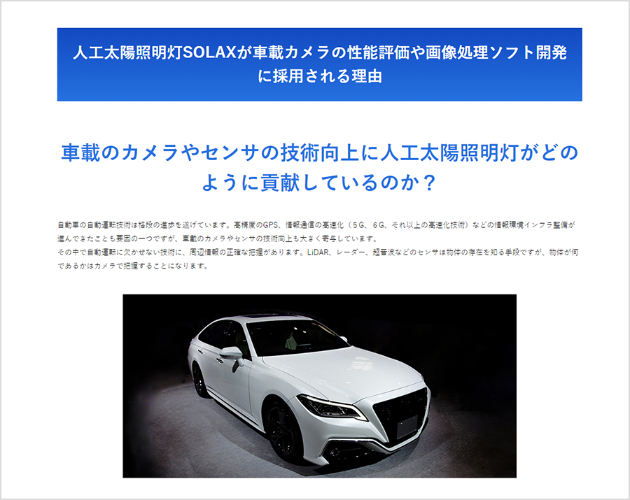 ・用途別採用実績「車載カメラの性能評価、画像処理ソフト開発」ページはこちらから人工太陽照明灯SOLAXが車載カメラの性能評価や画像処理ソフト開発に採用される理由