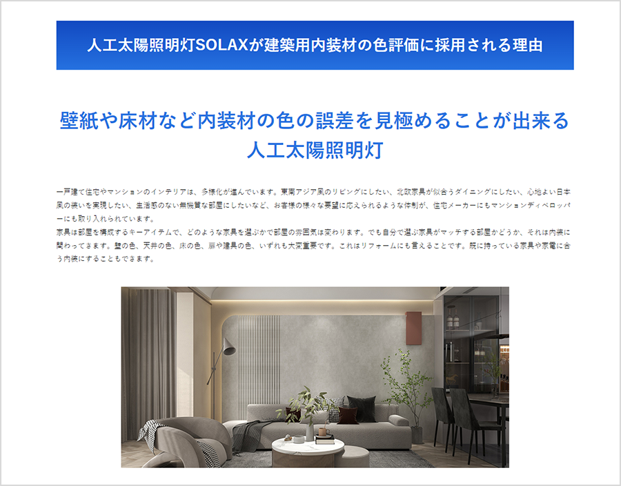 ・用途別採用実績「内装材の色評価」ページはこちらから壁紙や床材など内装材の色の誤差を見極めることが出来る人工太陽照明灯