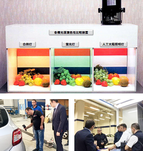 屋内で板金補修をして、晴れた日に外で見てみると「補修跡の境目がはっきりわかる」というようなことがありました。そんな問題に力を発揮した人工太陽照明灯SOLAX。今では自動車板金補修用光源として、国内のみならずヨーロッパの自動車ディーラーにおいてもお使いいただいております。