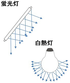 蛍光灯や白熱灯のような、広い面をまんべんなく照らす、 拡散性の高い照明だと、