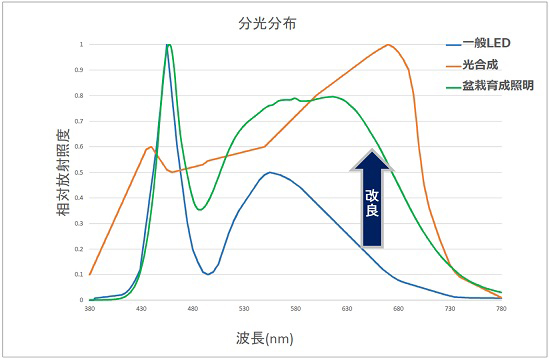 そこで、盆栽用人工太陽照明は光合成に必要な波長を一般LEDよりも大幅に改良したんだ。