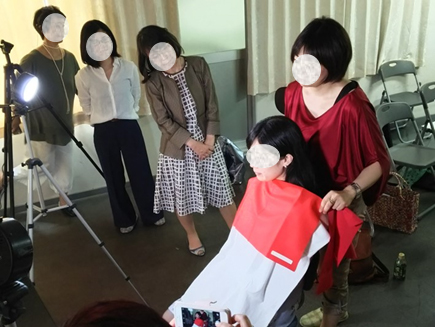 上の写真は、日本色彩学会の分科会であるパーソナルカラー研究会の皆様が弊社に勉強に来られた時の様子です。実際にパーソナルカラー診断をしている様子です。
