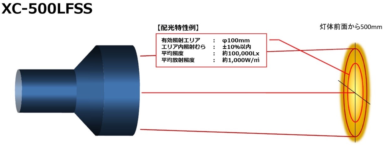 ※ご要望により、1sun(1000W/m2)や100000Lxを照射できる集光形スーパースポットタイプも製造できます。(XC-500LSS、XC-500LFSS)