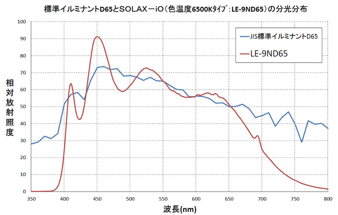 SOLAX-iOは、色温度5500K(形式:LE-9ND55)だけでなく、「JIS Z 8720」に規定されている標準イルミナントD65に