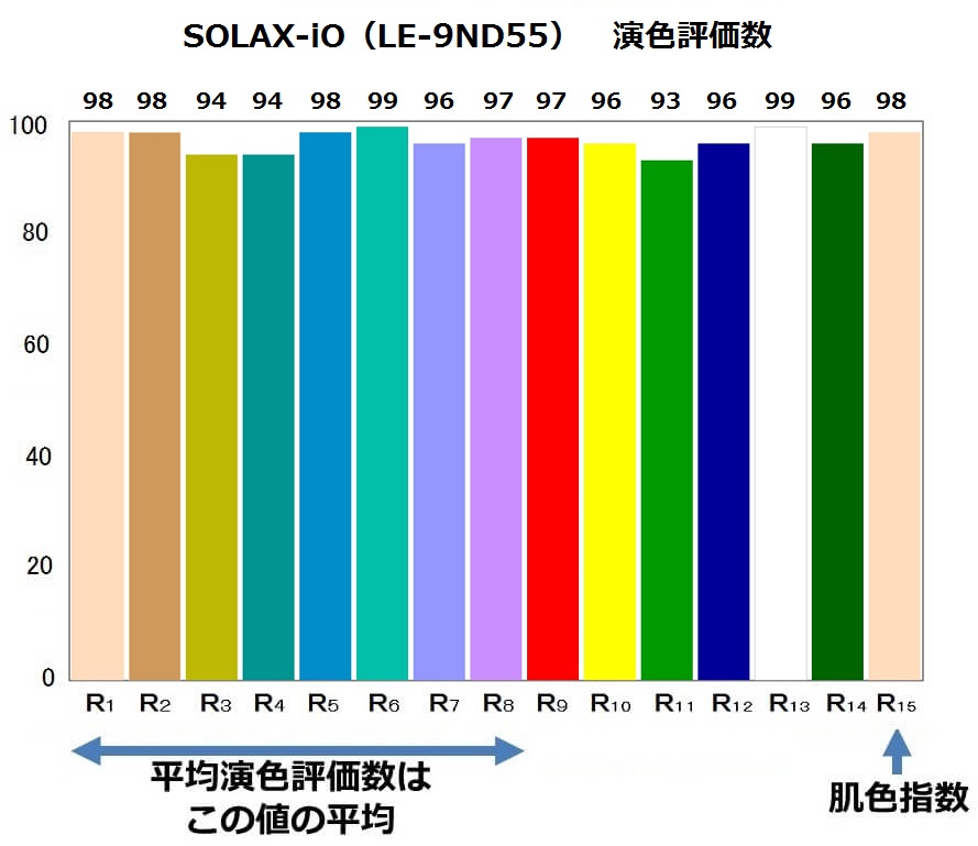 SOLAX-iOは、R1~R8までの平均値だけではなく、肌色指数であるR15の値も98と高いので、モノの色だけでなく人間の肌まできれいに再現することができます。