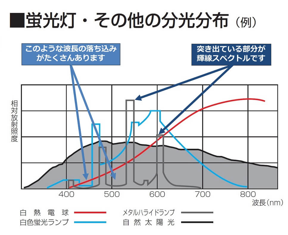 蛍光灯やハロゲンランプなどの一般的な照明では、下のグラフのように波長の落ち込みがでてしまいます。 この波長が弱い箇所があるために色を正確に見ることができません。 また、蛍光灯やメタルハライドランプは、際立って強い輝線スペクトルがあります。この輝線スペクトルがあると、色彩評価の際に大きな誤差が生じます。