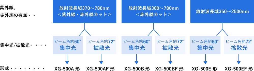 | 形式 | 基本形 | XG-500A 形 | XG-500AF 形 | XG-500B 形 | XG-500BF 形 | XG-500E 形 | XG-500EF 形 |